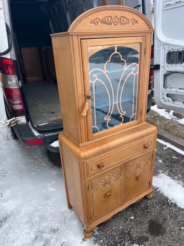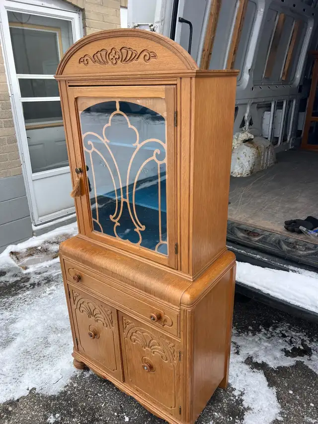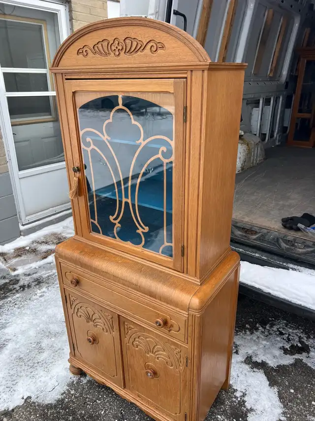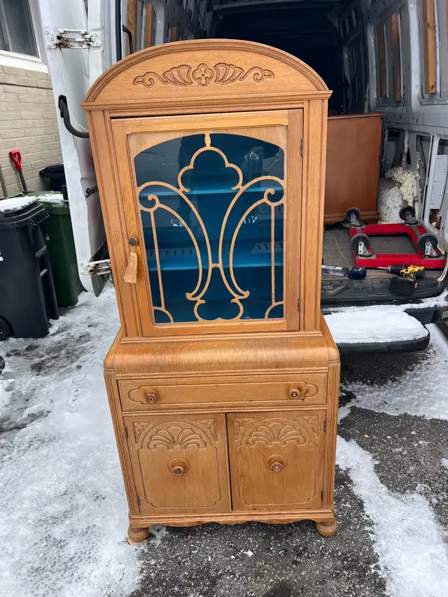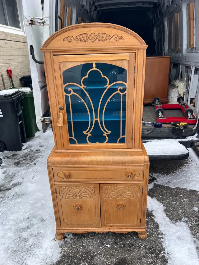 A charming antique vintage wooden display cabinet with ornate carvings. It features a glass door with decorative detailing and a bright blue interior. The cabinet has two drawers and two lower doors for storage.