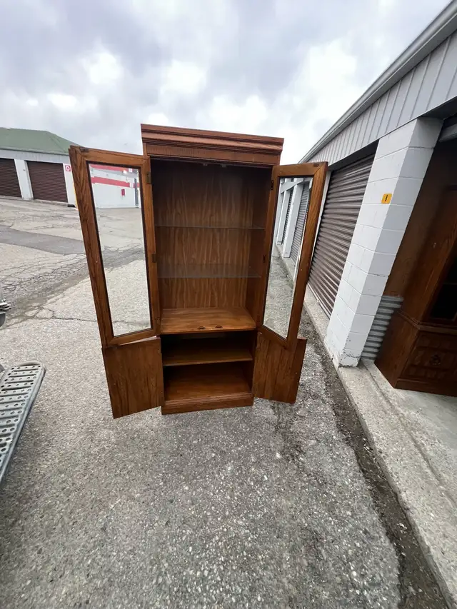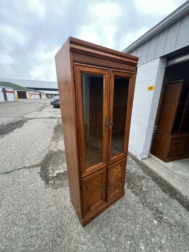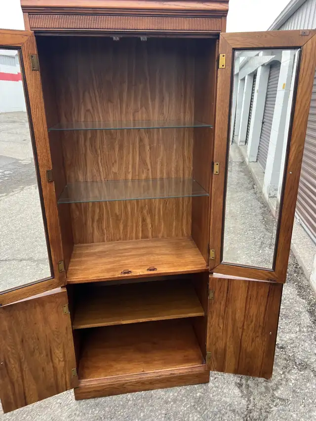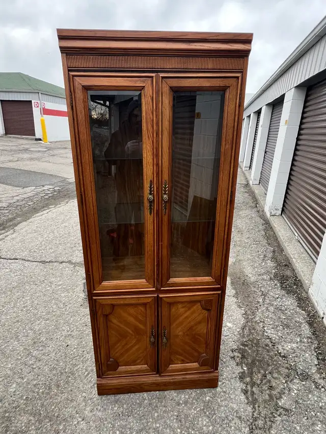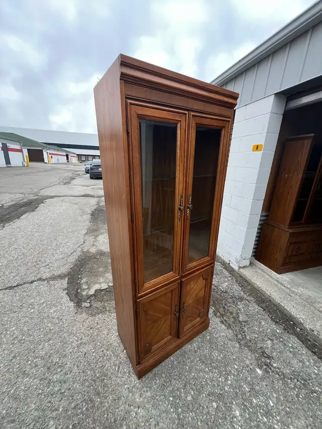 This is a used lovely wooden display cabinet with glass doors. It features two top glass doors and two lower solid wood doors. The rich wood finish would complement any living room or dining area.