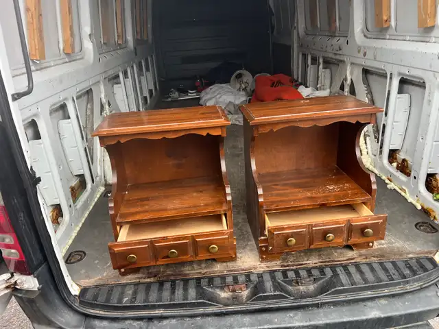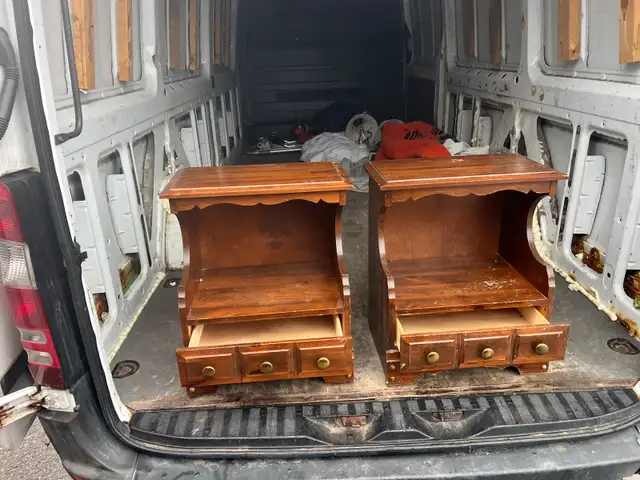Selling a set of used two wooden end tables. They're a nice rich brown colour and have two drawers each for storage. Some minor scuffs are visible on the surfaces. These tables would be useful for beside a sofa or bed.