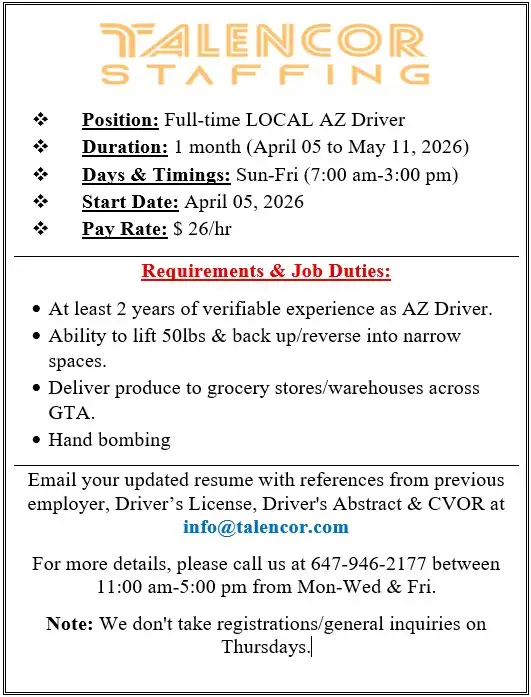 Email your updated resume with references from previous employer, Driver's License, Driver's Abstract & CVOR at *info@talencor.com* and if you need more details, please call *647-946-2177* from *11:00 am- 5:00 pm* from *Mon-Wed & Fri*. We don't take registrations/general inquiries on Thursdays.