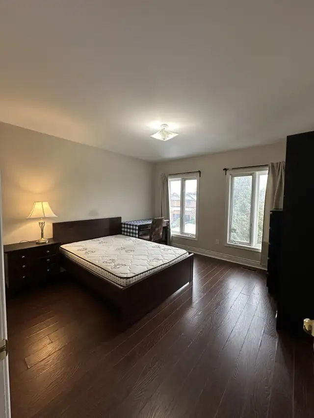 It's a nice, comfortable bedroom (the one shown in the photos with the big comfy bed, double size mattress, large wardrobe with mirrors, built-in desk , nice ceiling light, and plenty of natural light. The room feels private and cozy. The rest of the house is shared: modern kitchen with lots of counter space and cabinets, bright dining area with big windows, clean bathrooms (shower and tub options), and a large backyard with grass – great for relaxing or whatever. Everything's well-maintained and ready to move in.