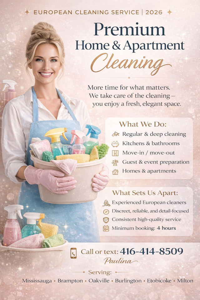 Professional European Cleaning Lady with 8 years of experience available for: