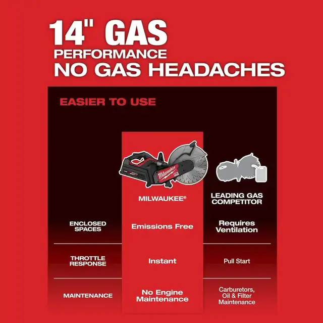 The MILWAUKEE MX FUEL 14" Cut-Off Saw w/ RAPIDSTOP Brake delivers 14 gas performance with no gas headaches. The POWERSTATE Brushless Motor delivers the power to cut tough materials like concrete, rebar, and ductile iron.