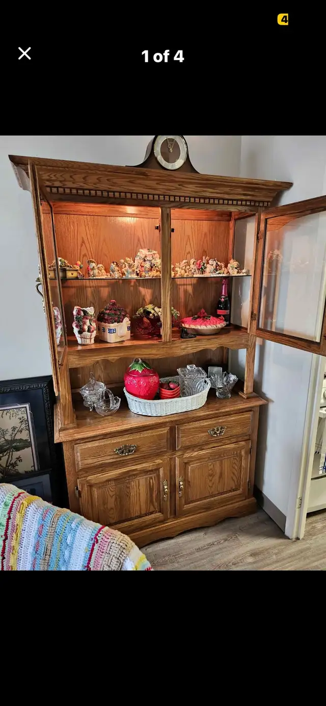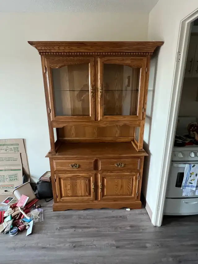This is a used lovely solid wood hutch, perfect for displaying your collectibles. It features glass-fronted upper cabinets and two drawers with ample storage below. The warm oak finish adds a touch of classic charm to any dining room or living space. It's a great piece for keeping your treasures organized and on show!