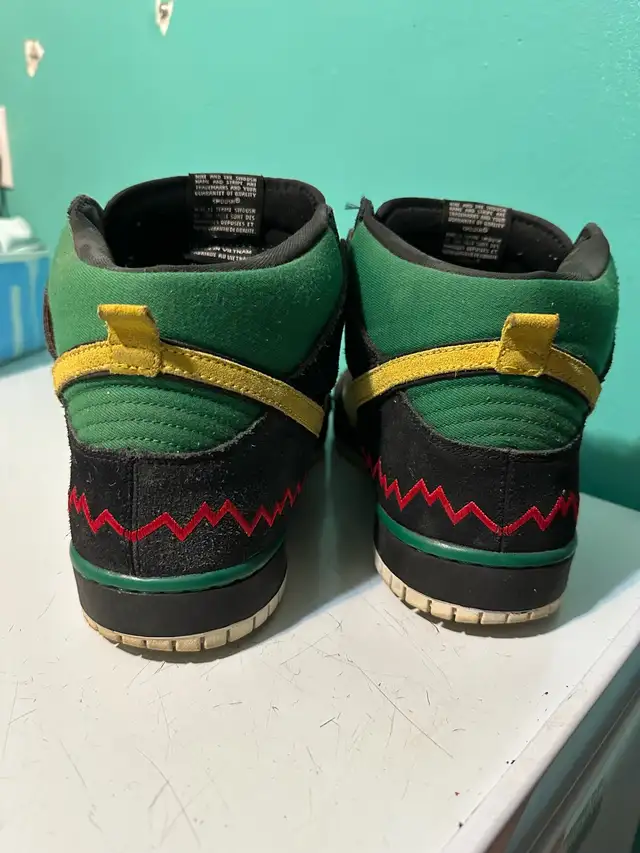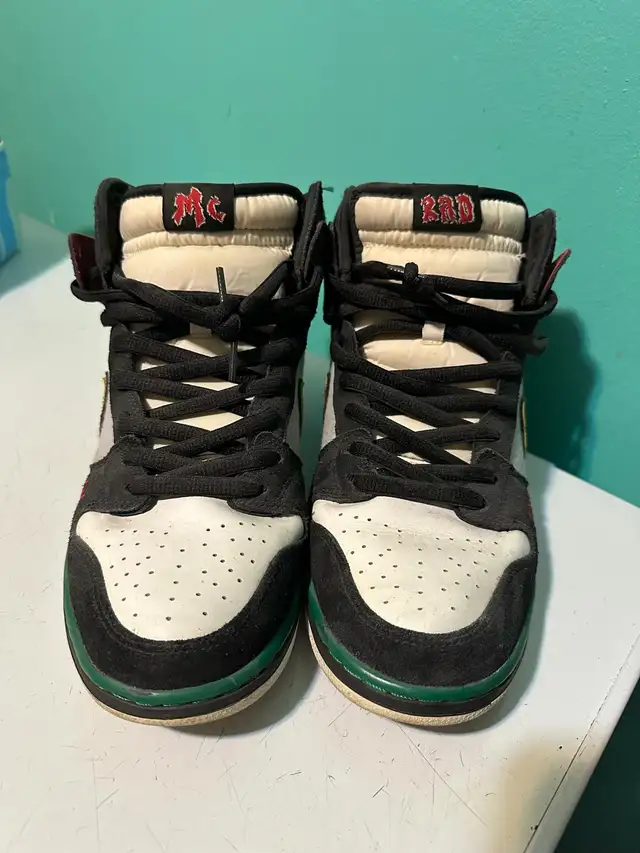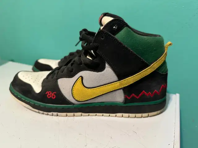 I'm selling a pair of used Nike Dunk High MC RAD shoes, size 12 US, released in 2012. These high-top sneakers feature a unique black, grey, green and yellow colourway with '86 and zig zag detailing. They're in good condition for their age, with some signs of wear, as shown in the photos. Perfect for collectors or anyone looking to add a unique pair of sneakers to their collection.