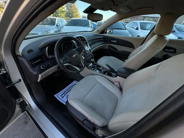 This Beautiful Chevy Malibu with light Gold exterior and Cream luxury interior includes climate control, cruise control, trip computer, oil-life monitor, tire pressure monitor, remote keyless entry, OnStar, two 12-volt power outlets, tilt and telescoping steering column, illuminated vanity mirrors, power windows with express down, four-way adjustable passengers seat, 60/40 split folding rear seat, sliding armrest, alarm, automatic headlights, 16-inch alloy wheels, power mirrors with integrated turn signals, tire inflation kit, and a six-speaker stereo system with AM/FM/CD/MP3, and Bluetooth handsfree phone. Key options include compact spare tire, rear park assist, remote starter, block heater and adds projector beam headlights, interior ambient lighting, premium cloth upholstery, MyLink infotainment system with seven-inch display, CD player, Bluetooth audio, USB port, satellite radio & Much More !