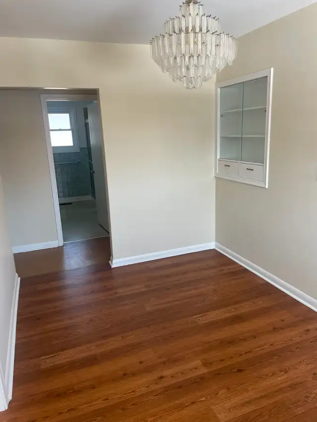 Living room and 3 bedrooms all hardwood flooring Newer linoleum flooring in Dining room and Kitchen, and same linoleum on Stairs to lower level