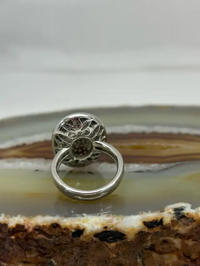 This ladies' custom-made ring is a striking blend of elegance and bold design, crafted in luxurious 14K white gold with a total weight of 8.4 grams. At its center lies a captivating oval setting, showcasing a brilliant arrangement of 86 bead-set white diamonds. These diamonds have a combined weight of 1.21 carats and display a clarity range from SI to I1, with a refined color grade of F–G, offering a bright, near-colorless sparkle that enhances the ring's brilliance.
