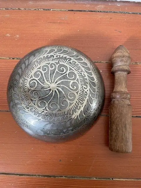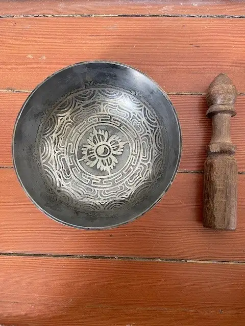 6” Handmade Nepalese singing bowl with a wooden mallet. Made from a seven-metal alloy including brass for a rich, complex harmonic range.