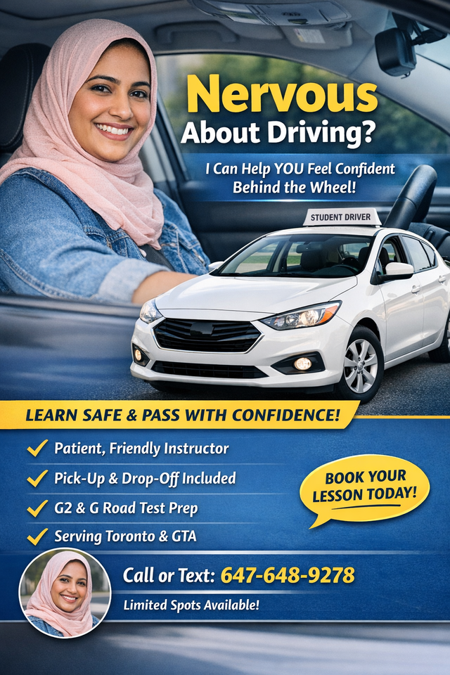 Hi, I'm Rabia — a licensed female driving instructor offering 1-on-1 lessons in Toronto.