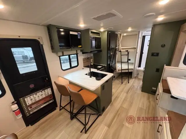 Pack up this very versatile Murphy bed travel trailer and head out to explore! You will love the space saving aspect that a Murphy bed gives you by not increasing the tow length in order to give you a separate bedroom and living space, and you don't even have to make the bed, just fold it up into the wall in the morning! Double-size bunks in the rear corner are perfect for accommodating both children and adults. The kitchen offers everything a cook would need to feed the whole gang and there is even a counter bar area with two stools which will be perfect for breakfast time. There is a booth dinette slide for more dining space, or a place to enjoy a board game or card game when you are inside. When the optional Beast Mode Package on this model is chosen, you'll enjoy a 400-watt solar package, a fresh water filter, a Maxxair roof vent cover, plus a Beast Mode independent suspension for better handling.