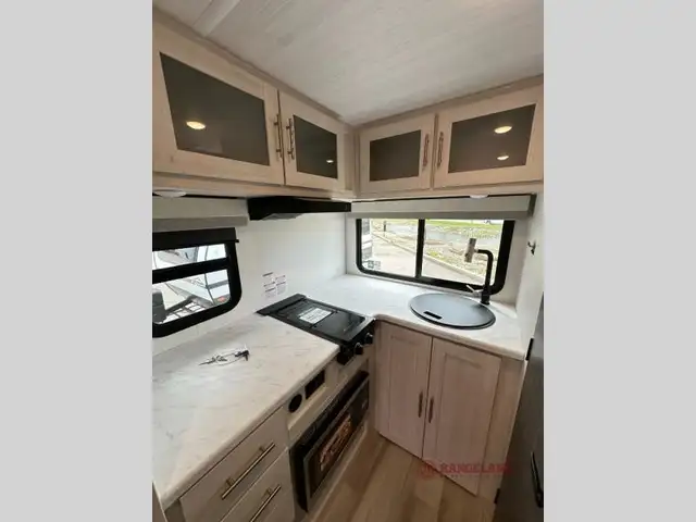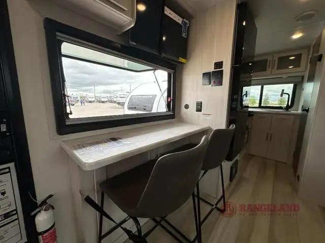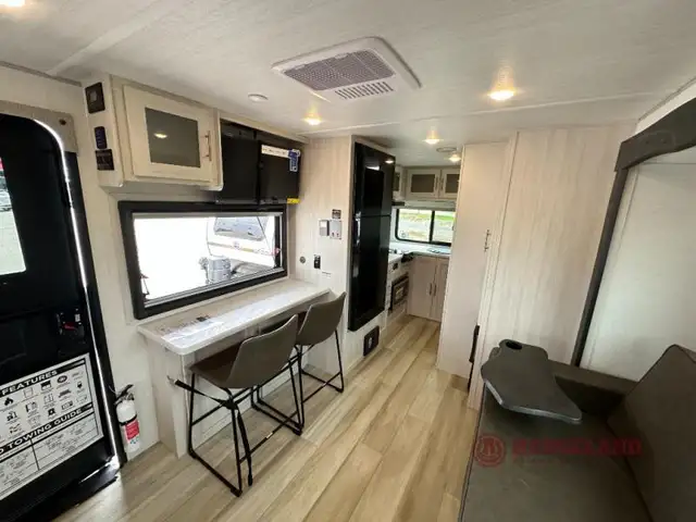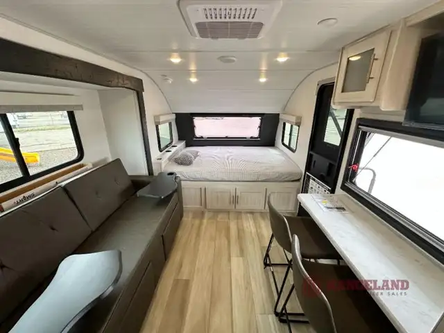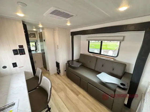 This travel trailer makes time at the campground easier than ever. Once you arrive at your site, you can put out the 14' awning, unload the exterior storage, then stretch your legs on a trail. The rear corner kitchen will let you make lunch when you return, and there is a bar top with two chairs where you can dine at. The jackknife sofa with leg rests is within a slide out so you can enjoy more floor space, and the front queen bed is sure to make you feel right at home. This model also includes the Hood River Edition that comes with Mud Legend all terrain tires with TPMS, advanced ground clearance, a MaxxAir vent cover, and 12V tank heaters!