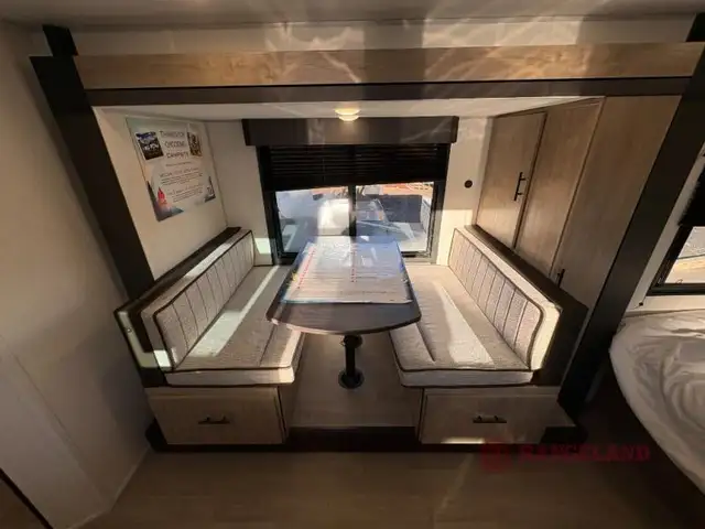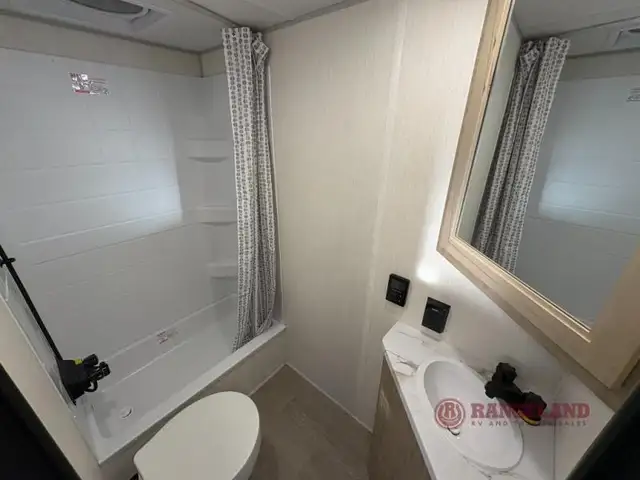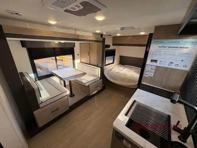 The Forest River Campsite Reserve travel trailers and toy haulers are built with cutting-edge features that make every journey unforgettable. Our rigs come equipped with Stable Step for safe and easy entry, Tufflex PVC seamless roof membrane with heat reflectivity to keep you cool, and power gear frame technology with space saver rail design for smarter space utilization. Inside, our kitchens are a haven for foodies, featuring an air fryer, convection, microwave combo, and a seamless solid surface countertop for effortless clean-up. LED interior lights set the mood, while USB-C charging stations keep your devices powered. Plus, our water filtration system ensures access to fresh, clean water wherever you roam!