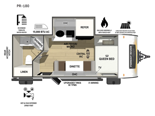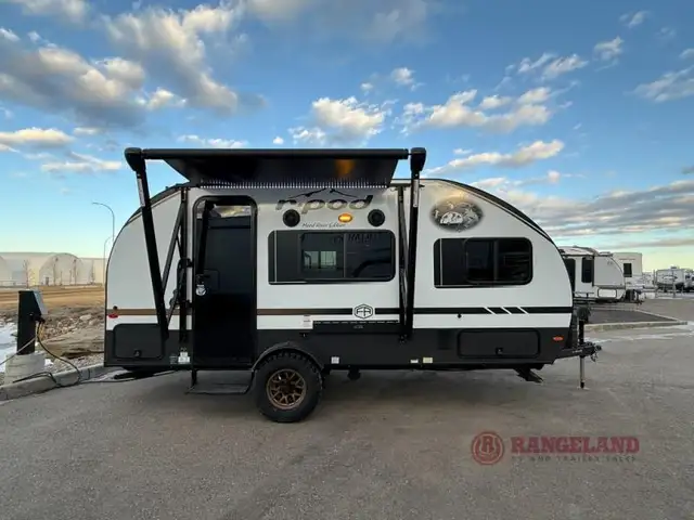With any R-Pod travel trailer by Forest River, you will enjoy affordable luxury at the lowest tow weight in its class! There is a sealed underbelly with forced heat, a curved dual-pane acrylic front window with a bug screen and night shade, plus a large roof mounted solar panel for off-grid capabilities. The 15K A/C unit will keep you comfortable during the summer camping months, and the tankless water heater will provide endless hot showers after hiking, biking, swimming and more! Each model also includes a black glass friction hinge entrance door, roof ladder prep, exterior motion lighting, plus a hot and cold exterior spray port to wash off sand from the beach. Inside, you'll enjoy seamless Surf-X kitchen countertops, blackout roller shades, and a central vacuum system for hassle-free cleaning!