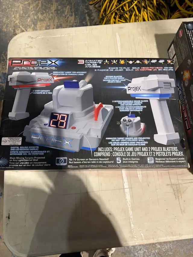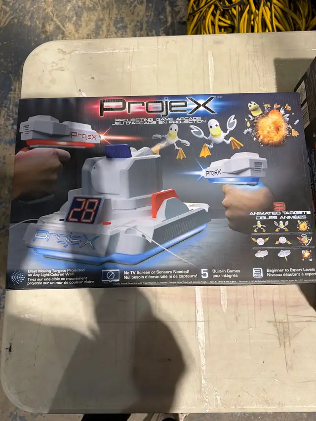 Découvrez ce jeu laser projecteur ProjeX, en excellent état et prêt à offrir des heures de divertissement! Ce jeu d'arcade à domicile projette des cibles animées sur n'importe quel mur de couleur claire, offrant une expérience de jeu immersive sans avoir besoin d'un écran de télévision ou de capteurs supplémentaires. Livré avec 2 blasters ProjeX et 5 jeux intégrés pour les débutants comme pour les experts. Les effets sonores numériques ajoutent une touche de réalisme à chaque partie.