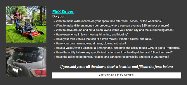 By popular demand, we are bringing back the FleX Driver Program! It's great for people who already have experience in Lawn Care, have their own vehicle and equipment, and want to make extra money on their free time. We had FleX Drivers that use Sedans with Trailers, SUVs, Vans, & Trucks. Think of it as being an Uber Driver that cuts grass. You will join a roster list of FleX Drivers in a area, and you will be offered jobs to do. If you dont accept, someone else will take them. Why not keep a flexible side job just in case?