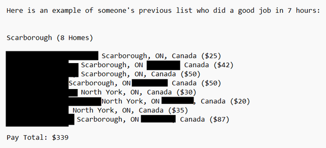 How it pays: If the list is complete with no problems, the total payout of the list can be sent via E-Transfer or Direct Deposit, after a week. Pay varies by how much homes you can do well. Its normal for $400 to be made on a weekend.