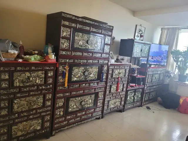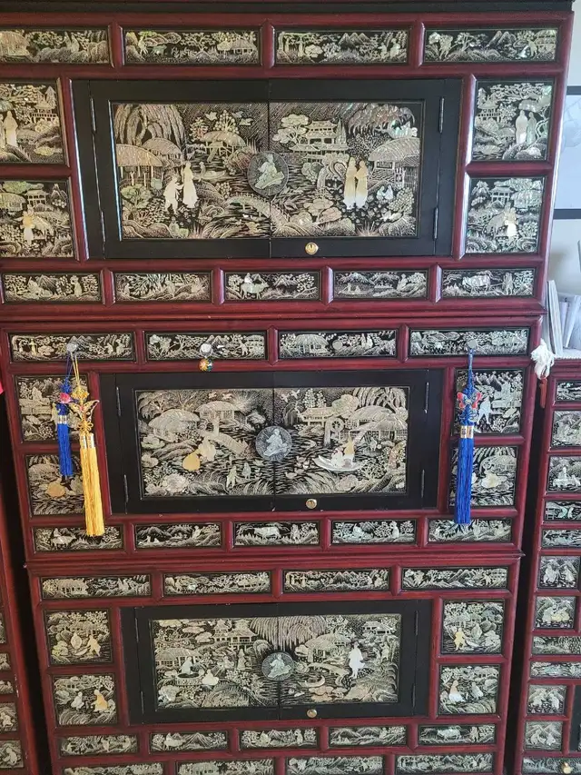 Beautiful traditional Korean mother-of-pearl cabinet set in excellent condition.
