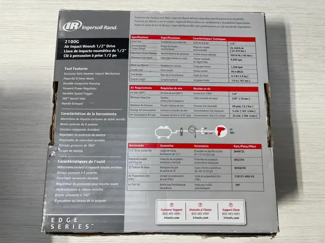 With a great power-to-weight ratio, the Ingersoll Rand EDGE Series 2100G 1/2" Composite Air Impact Wrench makes it comfortable to get the job done. Delivering 550 ft.-lbs. of maximum reverse torque and weighing only 4.3 pounds, this tool has what it takes to handle the toughest jobs. This powerful, lightweight pneumatic impact wrench delivers high torque through a sophisticated power management system. Applications for the 2100G include tire changing, engine repair, engine component installation and removal, body work installation and removal, farm implement assembly and repair, auto repair and maintenance, and truck repair.