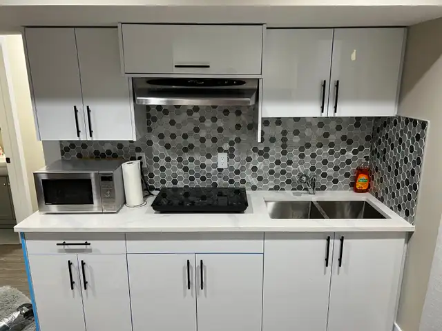- A functional kitchen layout equipped with stainless steel appliances - New Fridge, Cook top, Microwave