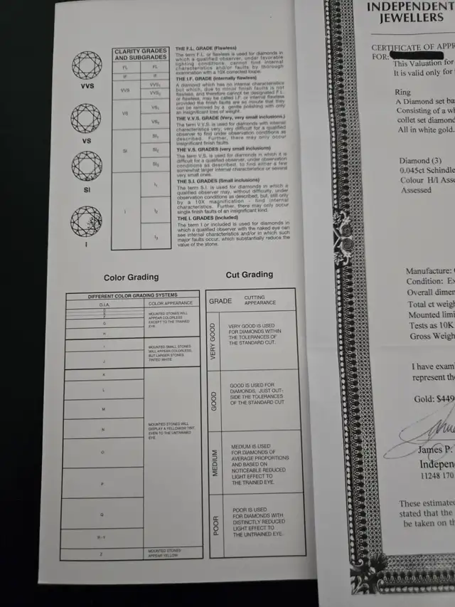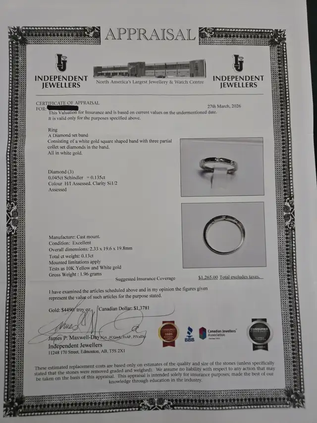 I am selling this nice white gold 3 diamond ring for my daughter who only wore the ring couple times before breaking up with her boyfriend who gave her the ring. It is basically new and she just had it appraised by Independent Jeweler's at replacement value of $1378. She would like $300 cash for the ring. Call or text me at 250-320-2470 anytime. I live in Beaumont. I could possibly deliver the ring locally around the Edmonton area.