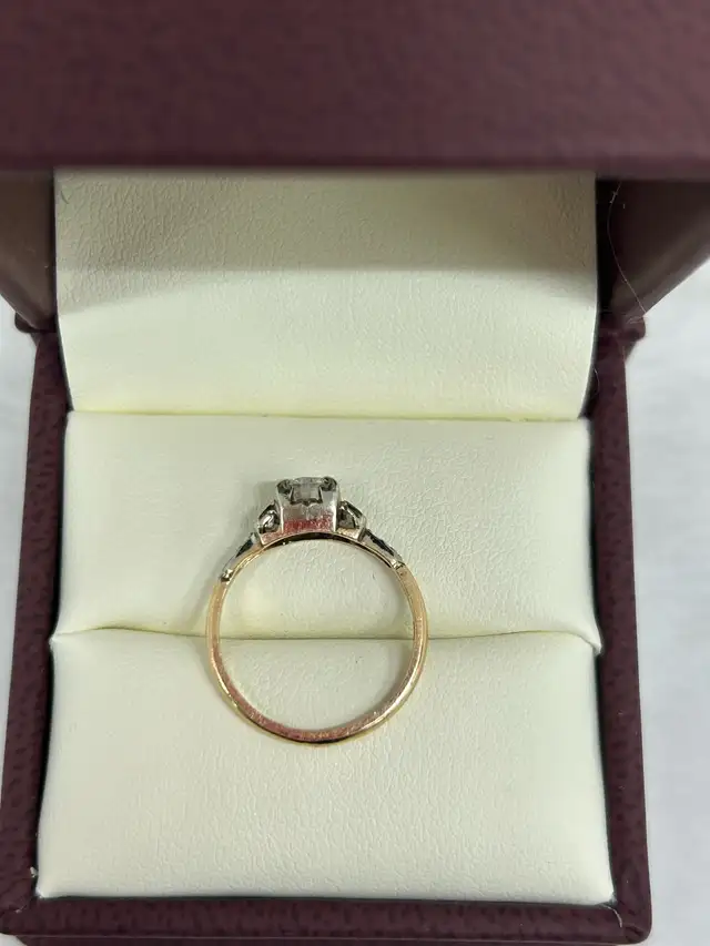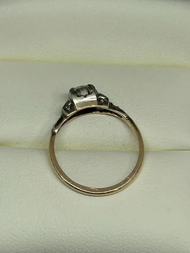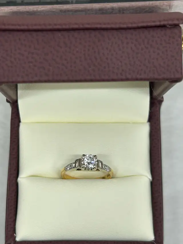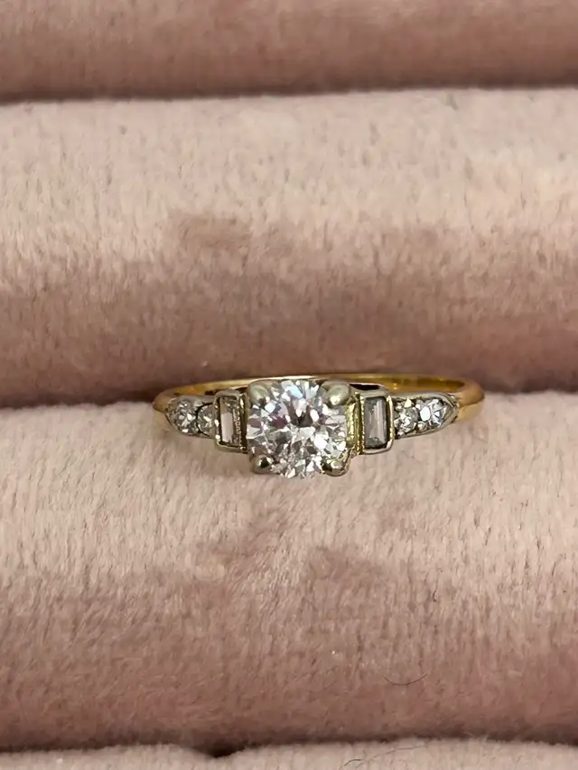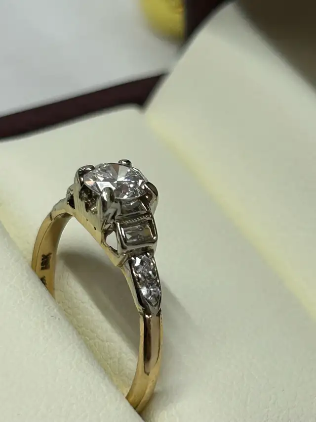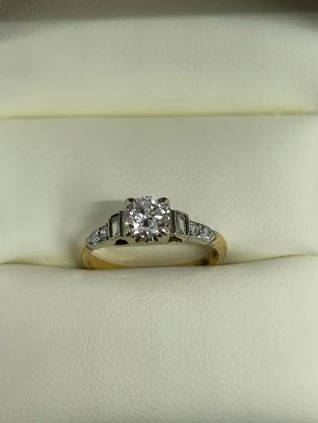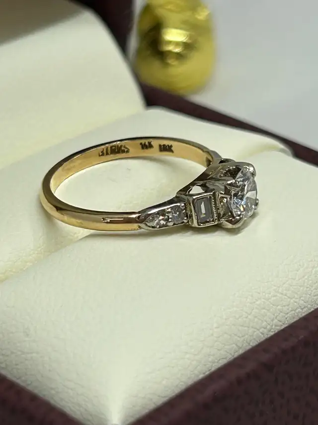 This vintage Birks mark two-tone diamond ring is a refined example of classic craftsmanship and balanced design. Fashioned in 14–18K gold, the piece weighs approximately 1.7 grams, At its center sits a striking 0.45 carat Old European cut diamond, secured in a traditional one-claw setting that allows maximum light exposure. The stone displays VS1 clarity with a warm, elegant G color grade, offering both brilliance and character typical of antique cuts.Flanking the central diamond are two straight baguette diamonds, bezel-set for a sleek and structured look. Together weighing approximately 0.10 carats, these side stones exhibit VS clarity with an I–J color range, subtly complementing the center stone while adding geometric sophistication.