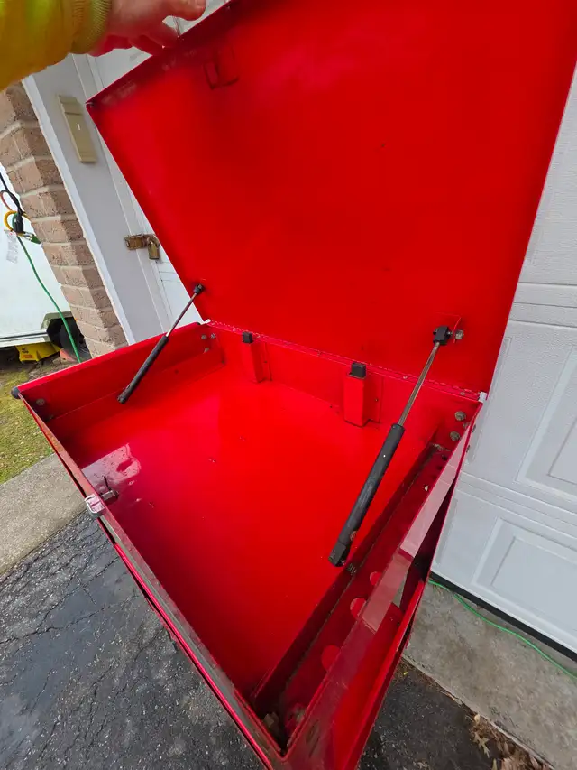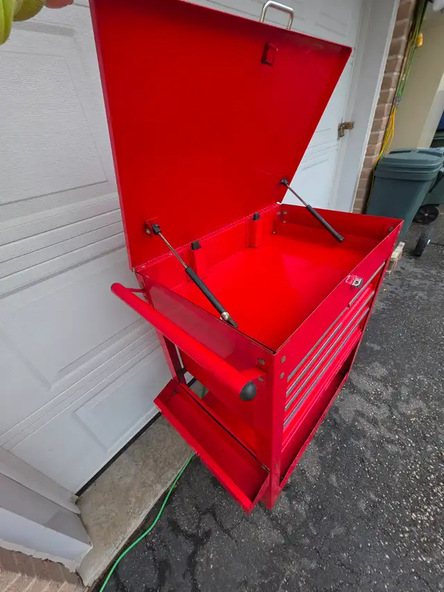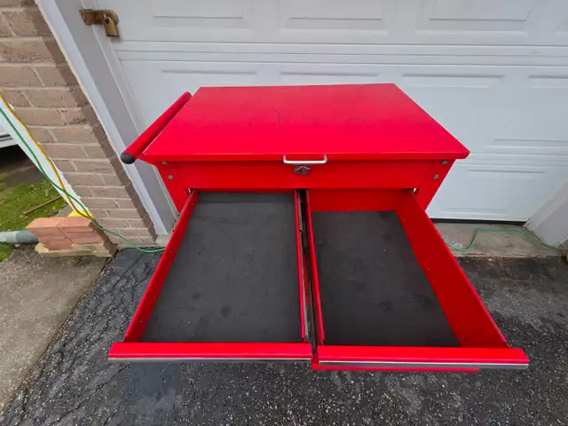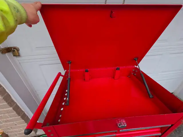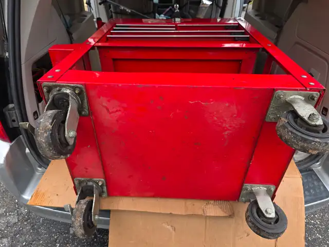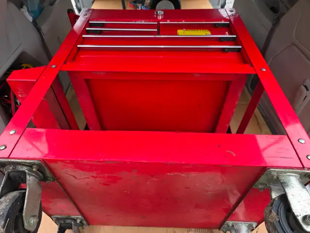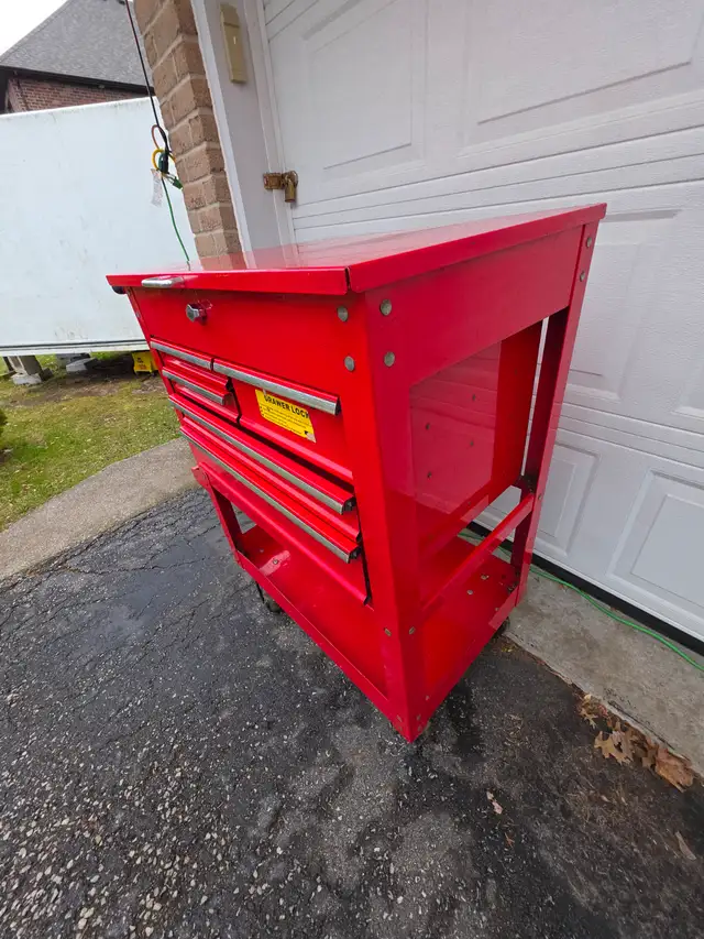 For sale a used U.S. GENERAL 30 in., 5 Drawer Mechanics Cart, Red With Padlock Security Locking Mechanism.
