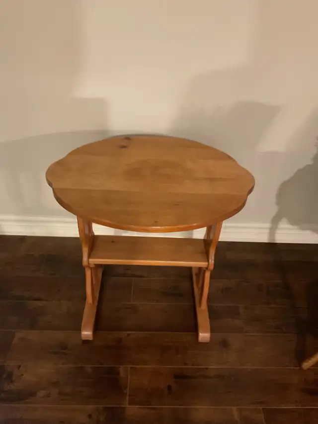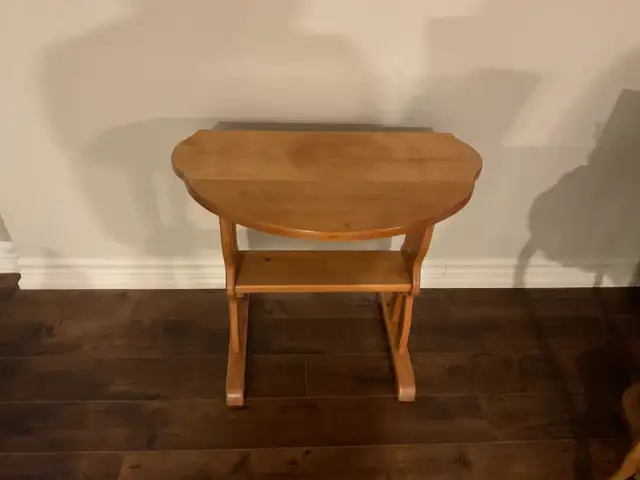 SOLID WOOD PINE DROP LEAF TABLE, 23 3/4 INCHES WIDE x 19 1/8” DEEP x 22 1/2 INCHES HIGH WHEN FULLY EXTENDED, AND 23 3/4 INCHES WIDE x 9” DEEP DROP LEAF DOWN (2). VERY VERSATILE, IN EXCELLENT CONDITION.
