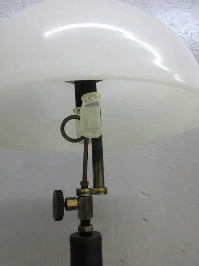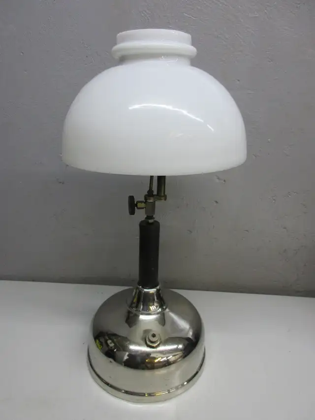 This lamp is in excellent condition, embossed. Features a Q99 and shade holder. Original Coleman 306 lamp shade. $200. Warden/Eglinton, Scarborough. 416-751-3469