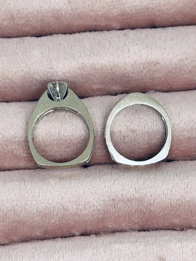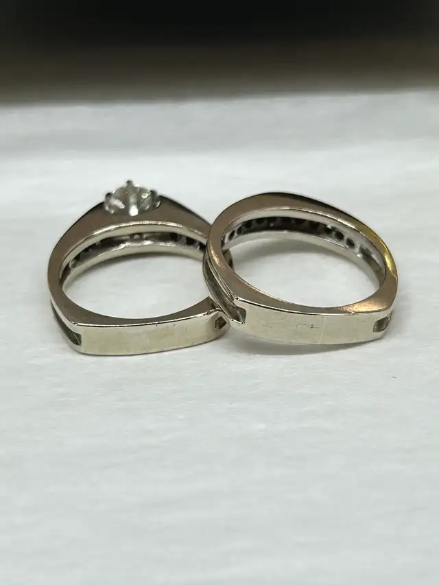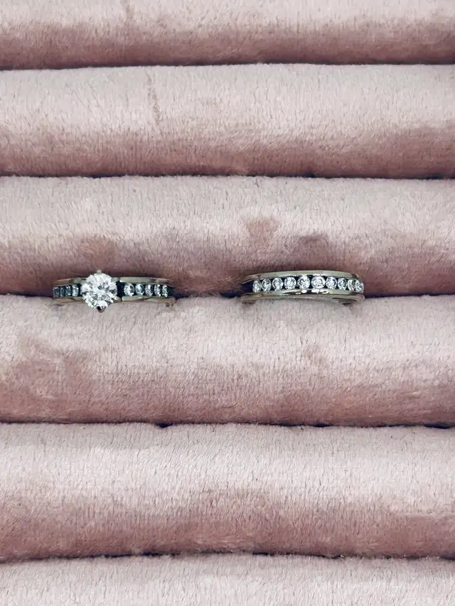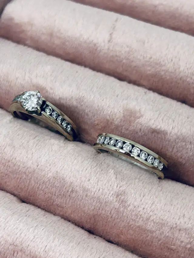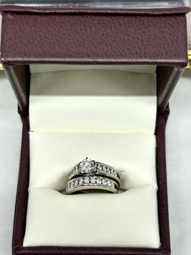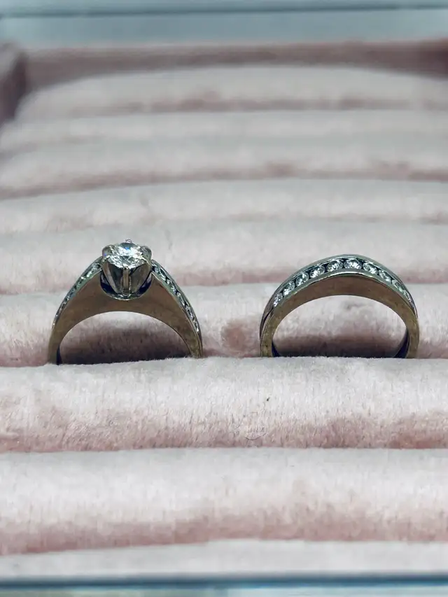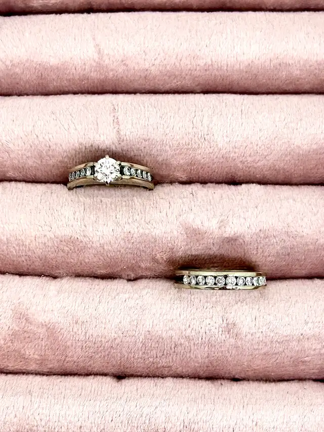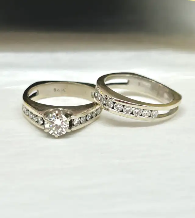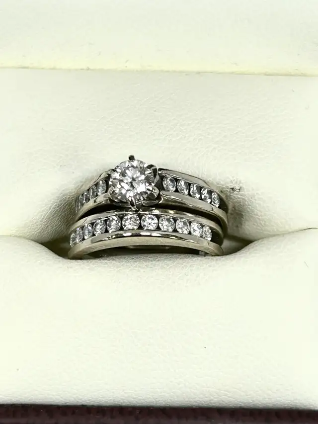 This Appriased custom-made ring is crafted in 14k white gold, weighing 7.90 grams, and features a 0.45 carat round brilliant cut center diamond in a claw setting with VS2 clarity and G color, accented by 21 channel-set round brilliant cut diamonds totaling 0.64 carats with clarity ranging from VVS to VS and color ranging from F to G.
