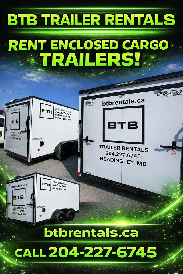 We have over 30 trailers for rent to cover most any of your hauling needs. No hidden fees, unlimited mileage. $500 credit card damage deposit required. All trailers are new, clean, and regularly maintained. Open 7 days a week! Weekly rates available. Call to make a reservation 1-204-227-6745. Personalized service. Not all trailers pictured. If you don't see what you are looking for call or text us. Daily rates: