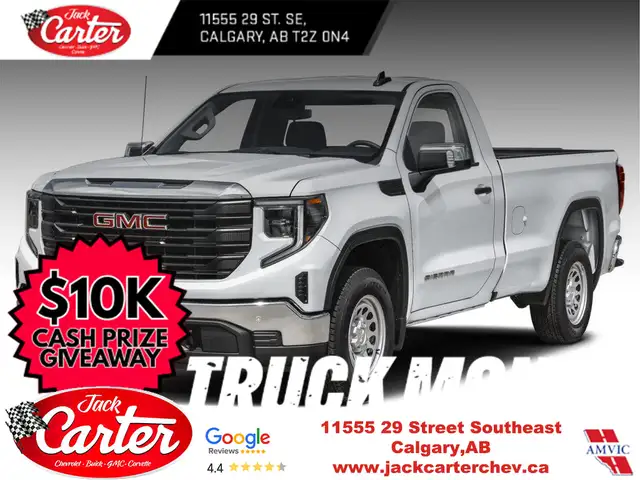 Looking for your best deal on a new Sierra in Calgary? Then try shopping with us: Jack Carters Chevrolet Buick GMC. Located in SE Calgary with easy access off the Deerfoot and Douglasdale, we've been giving Calgary and surrounding area the best deal and the best service since 1962. Our Sales staff is experienced and friendly making your truck purchase easy and straightforward. No games, no gimmicks, no marked up GM MSRPs like our competitors do, just great advice and low prices from the start. True GM window stickers on diplay on our lot and in our showroom. Call us for a consult today 403-258-6300Choose your Model, flexibility of short box, standard box or long box. Choose your Cab fro Reg cab, Double cab and crew cab. Choose your engine from the 6.2L V8 that delivers best-in-class V8 power and towing, an available LZ0 Duramax® 3.0L Turbo-Diesel that offers better fuel efficiency than any other full-size pickup, the legendary 5.3L V8, and GM's new Turbo 2.7L option producing the same torque as the 6.2L V8. Choose your trim from the everything you need Pro, the new tried and tested SLE and the SLT, sporty Elevation, the top of the line Denali and Denali Ultimate, or go with our factory lifted lineup: the At4, or the overcome anything AT4X. Choose Jack Carter and give our friendly sale staff a call at 403-258-6300 or visit us at jackcarterchev.com. Key Available features: 4X4 / Four Wheel Drive, G80 Locking Differential, Z71 Off Road Suspension, X31 off Road package, Front Bucket seats, Leather seats, Power passenger seat, memory seats, Max Trailer Package, NHT, Bose sound system, Power sliding rear window, Remote start, heated seats, heated steering wheel, cooled seats, Front park assist, rear parking assist, Surround vision camera, Wireless charging, Adaptive cruise control, Supercruise, Carbon Fiber Bed, Premium Suspension with adaptive ride control, XM radio, Apple Carplay and Android Auto, Massage seats, rear camera mirror and more.