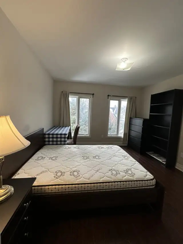 It's a nice, comfortable bedroom (the one shown in the photos with the big comfy bed, double size mattress, large wardrobe with mirrors, built-in desk , nice ceiling light, and plenty of natural light. The room feels private and cozy. The rest of the house is shared: modern kitchen with lots of counter space and cabinets, bright dining area with big windows, clean bathrooms (shower and tub options), and a large backyard with grass – great for relaxing or whatever. Everything's well-maintained and ready to move in.