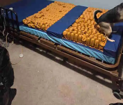 Metal hospital bed with movable rail. Head and feet raise and lower. Entire bed raises and lowers. Has a blow up area, with pump, to help with bed sores. Has a connected remote and also a crank for power loss. Must pick up! Comes apart. Please text if interested 705-818-9999