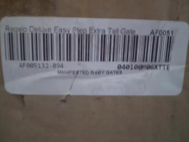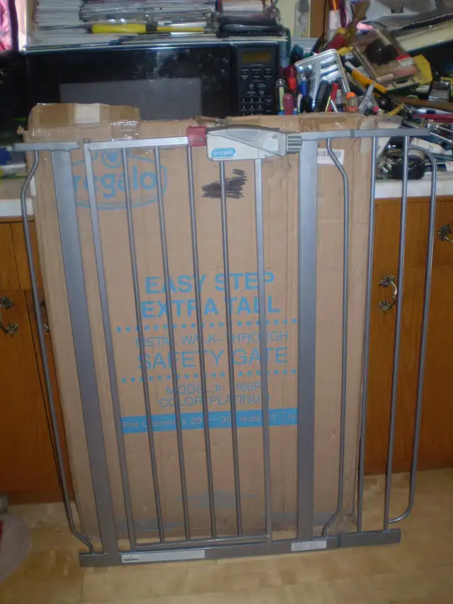 REGALO 1166P. EXTRA TALL SAFETY GATE. New in opened box. Bought off Amazon before Pandemic and never used. Silver painted steel baby gate with door. Fits using threaded rods that put tension top and bottom. Comes with all 4 tensioners for door openings and 4 cups for drywall. Missing cup screws. Instructions downloaded from internet. Basic gate fits opening 29 to 39 inches. Additional section as well for an additional 7 inch extension for 36 to 48 inch openings. Gate opens one way only and is 16 inches wide. Gate lock has red safety latch to confound little fingers. Comes in distressed box.