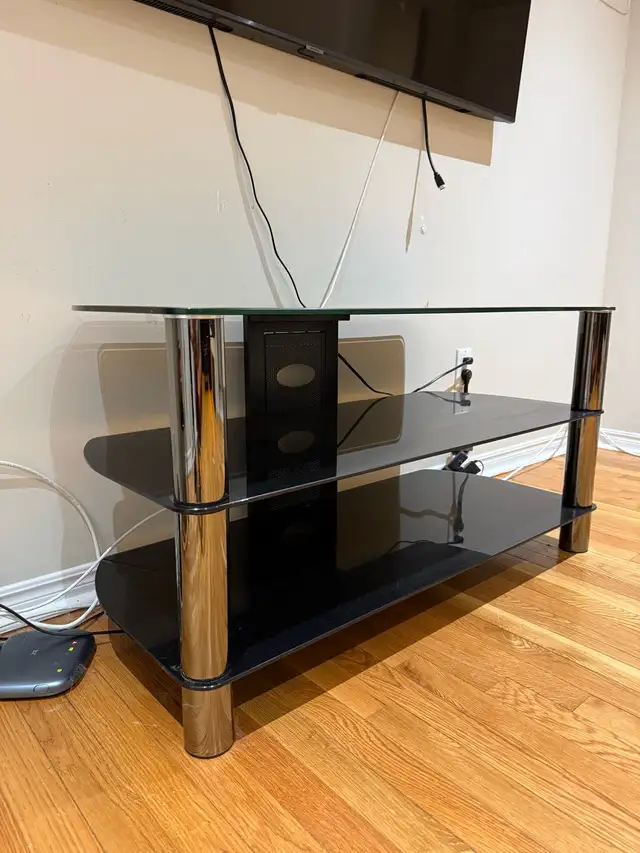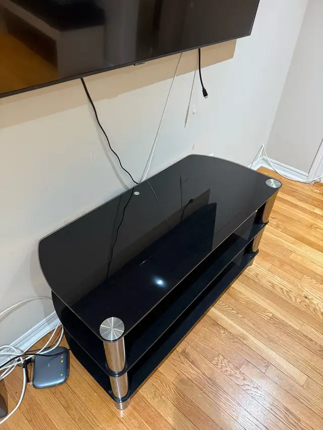 This black glass TV stand is perfect for any modern living room setup. It features three shelves to hold all your media devices and accessories. This item is in used condition.