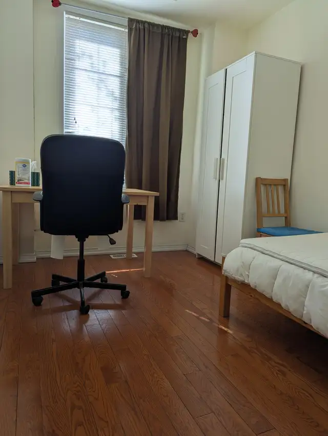 The room has a large window facing street, full of natural light, very bright. Room is fully furnished, including twin bed/mattress, mattress cover, wardrobe, large table, chair, curtain etc.