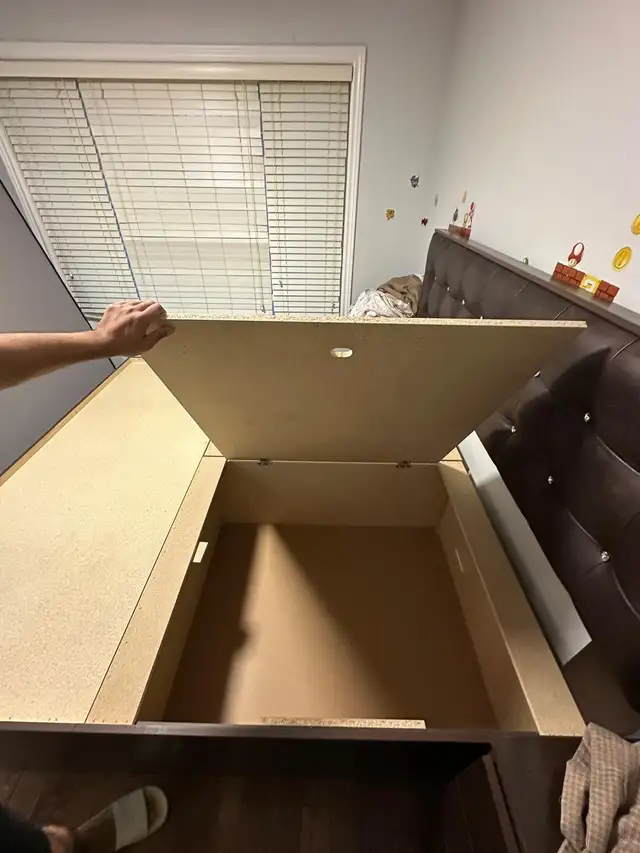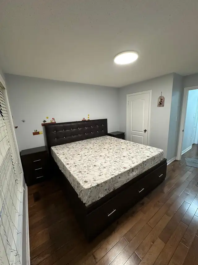 All pieces are well maintained, sturdy, and made with durable wood. Leather bed frame adds a modern touch, no damages.