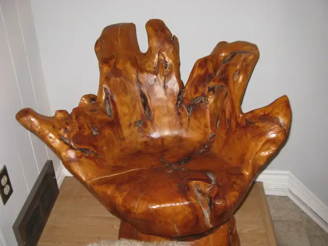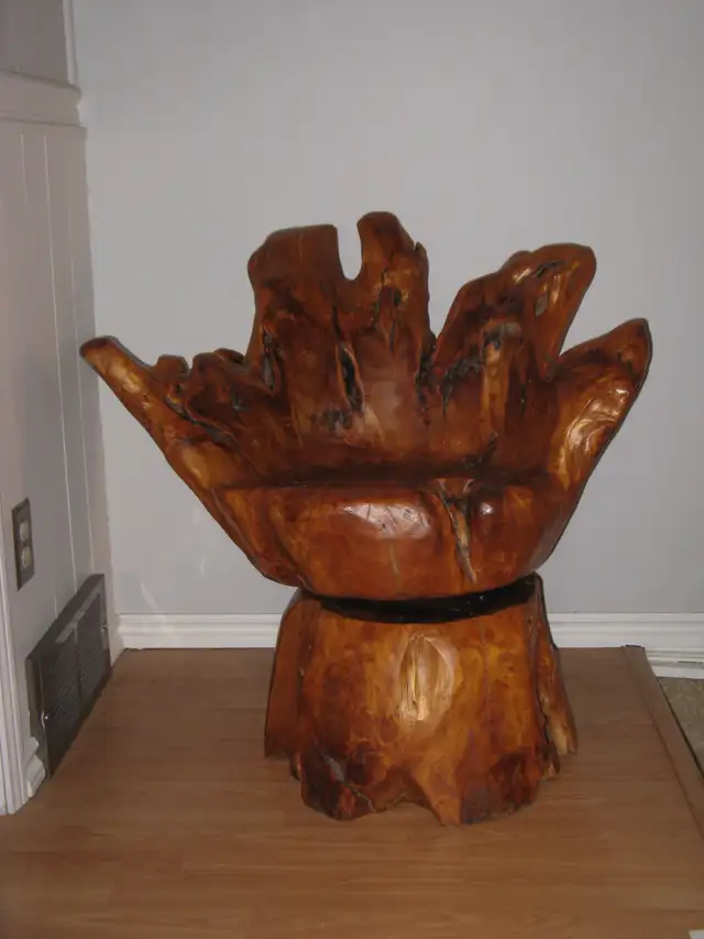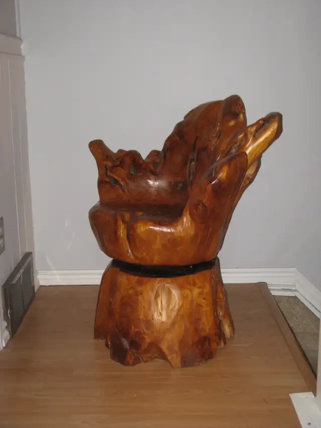 I have a fabulous handcrafted wood swivel chair made by a craftsman in Turner Valley. It's a bit hard to measure because of the uneven edges ~ it's about 31 1/2" wide x 30" high from the ground to the highest point on the back x 18" from the ground to the seat. It's in very good condition. I am posting this for a friend so please don't message me. If you'd like to come by to view please call 403-608-6787 between 9 am to 8 pm to make an appointment.