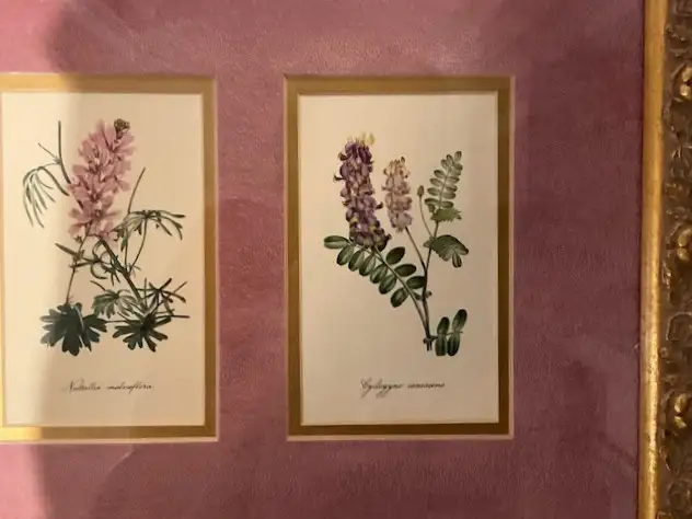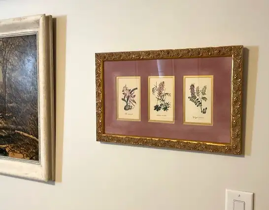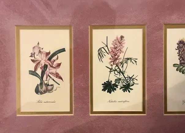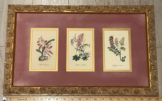 Images 1 – 5: Vintage floral wall art featuring three botanical illustrations with their Latin names. Set against a rich burgundy ‘velveteen' mat and housed in an elegant gold-toned frame. It measures 20” x 13” and it ready to be displayed. The frame is ideal as a statement piece showing timeless elegance. Ideal for an Art Deco, Hollywood Regency, or any tastefully curated interior.