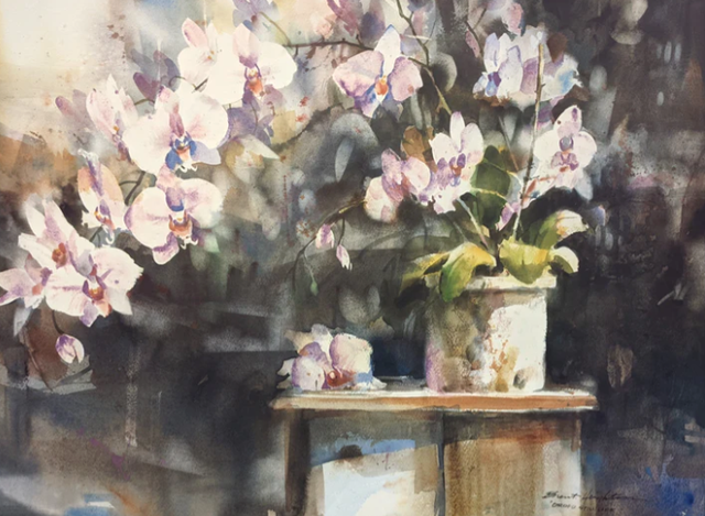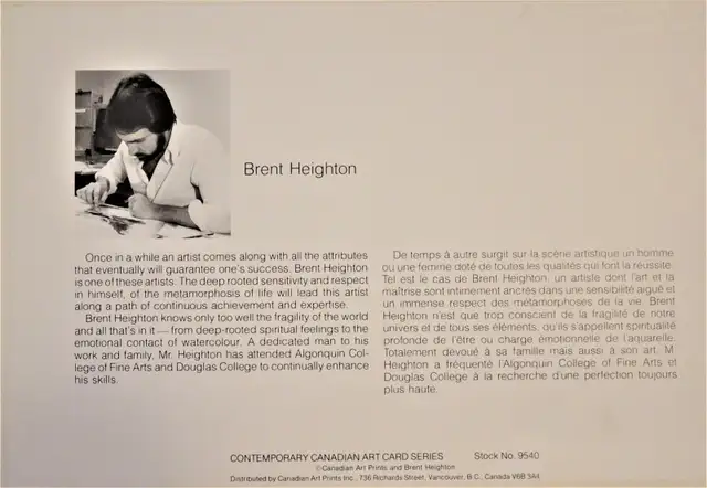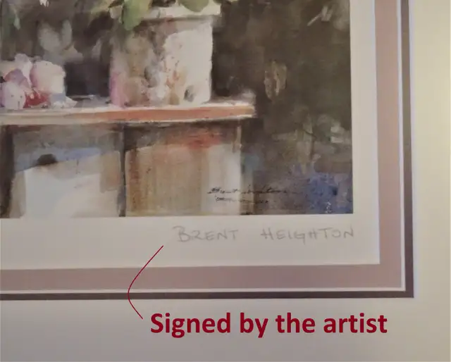 Images 6 – 10: Canadian Brent Heighton's personally signed “Orchids – Still Life” has been professionally mounted behind non-glare glass. Measuring 20” x 13”, this open edition print is a reproduction of the original artwork, showcasing the artist's unique vision and craftsmanship. Perfect for art enthusiasts or collectors looking to add a touch of Canadian artistry to their space. This signed art piece is available for $35.
