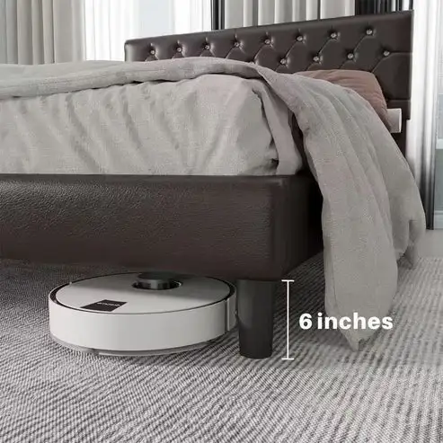 Includes headboard, footboard, rails and slats Polyester microfiber upholstery. Brown faux leather cover. Button-tufted, wingback headboard accents. Exposed wood feet Included slats eliminate the need for a foundation/box spring Mattress available, sold separately