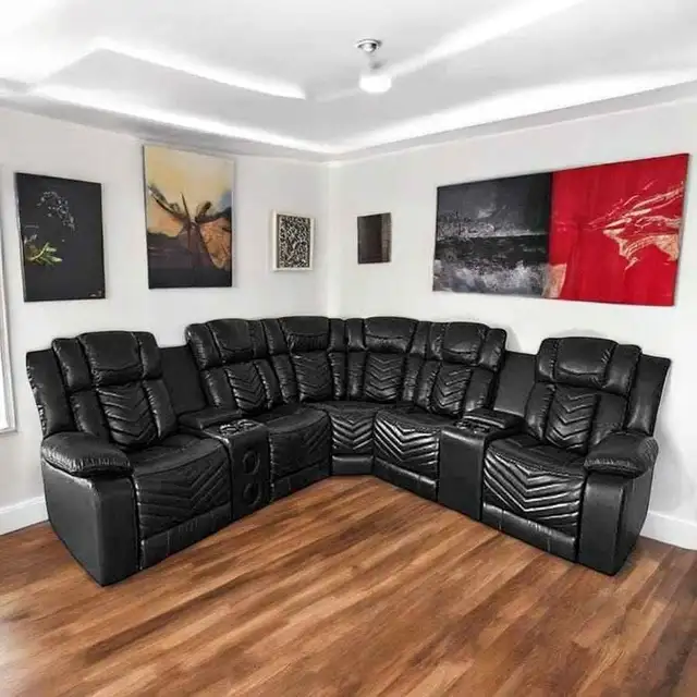 Modern brown leather sectional sofa with a spacious L-shaped design. Features plush, comfortable seating, supportive back cushions, and built-in recliners for added relaxation